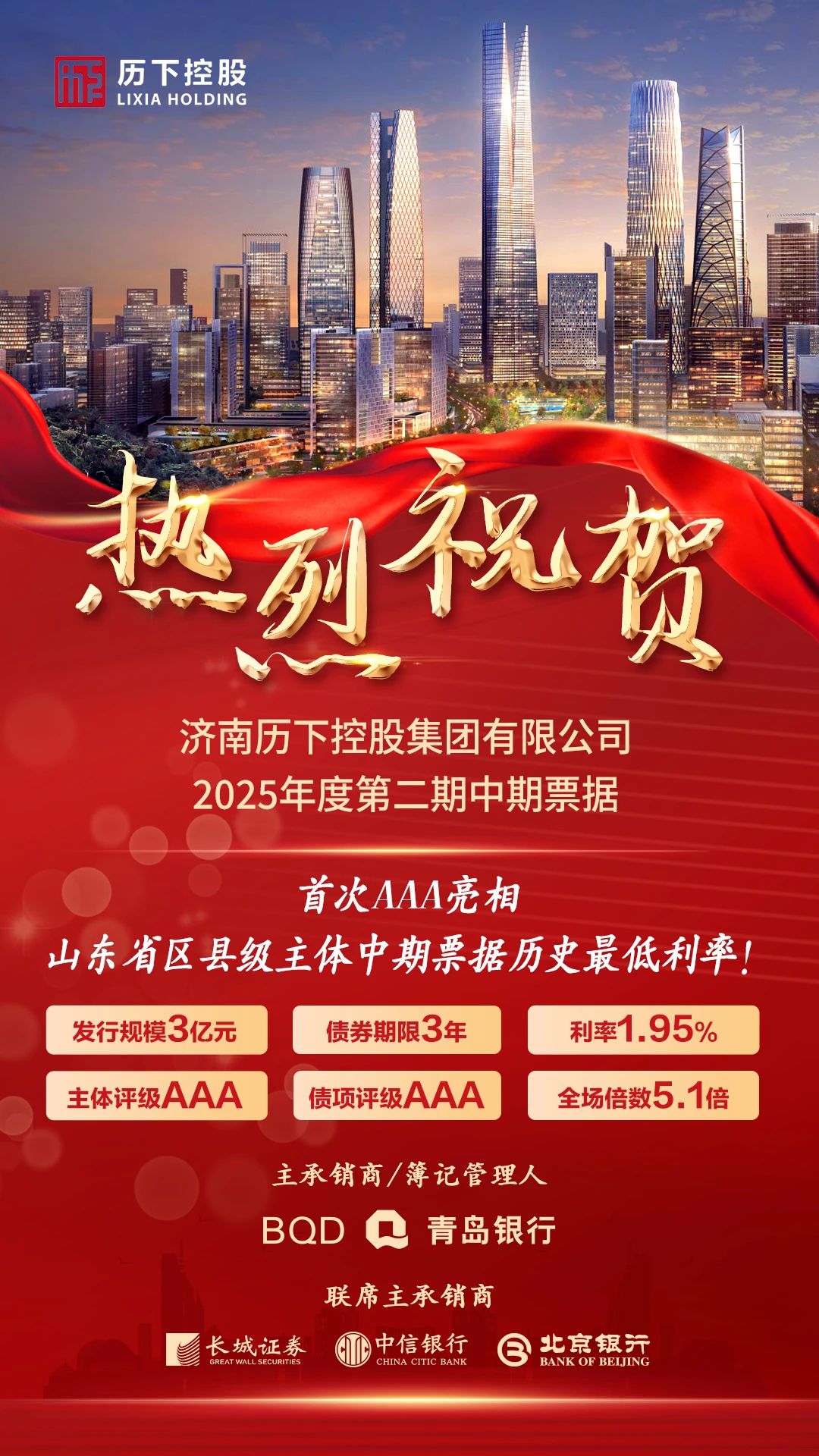 2025年7月24日,济南九游官方网页版集团有限公司成功发行2025年第二期中期票据,发行金额3亿元,期限3年,票面利率1 95%,全场认购倍数5 1